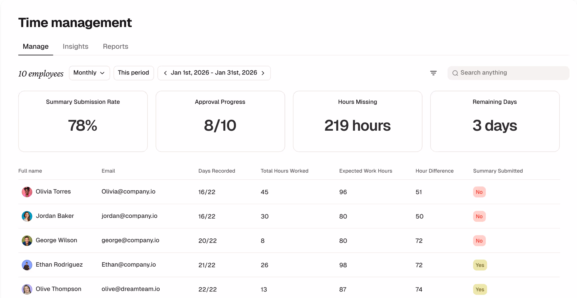 Easily create time management reports showing hours worked, expected hours, and difference between the two. Export easily to your payroll system, and share with stakeholders.