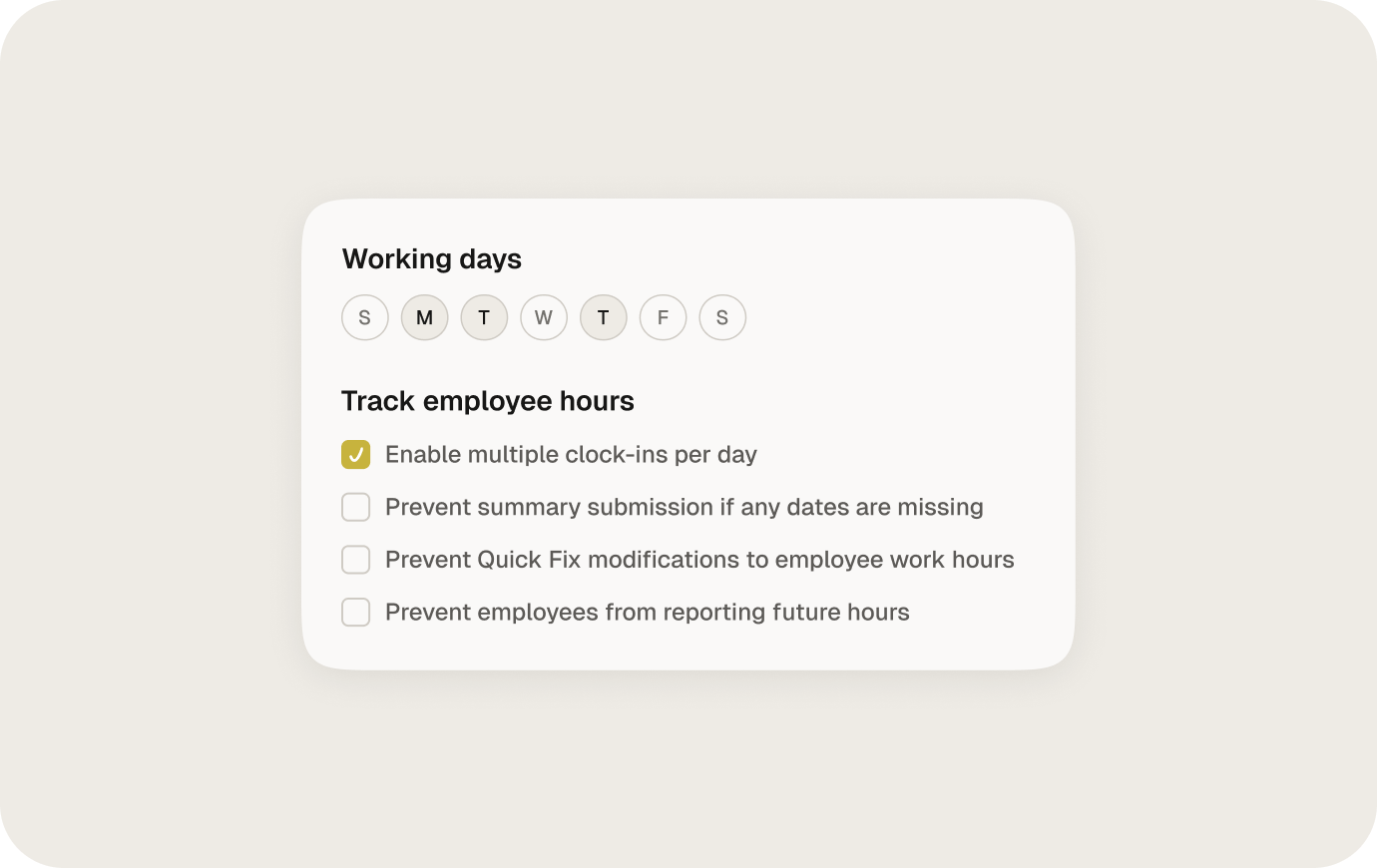 Control every bit of time tracking, like multiple clock-ins, supporting quick-fix for easy modifications, prevent employees from reporting future hours, and set required hours per day.