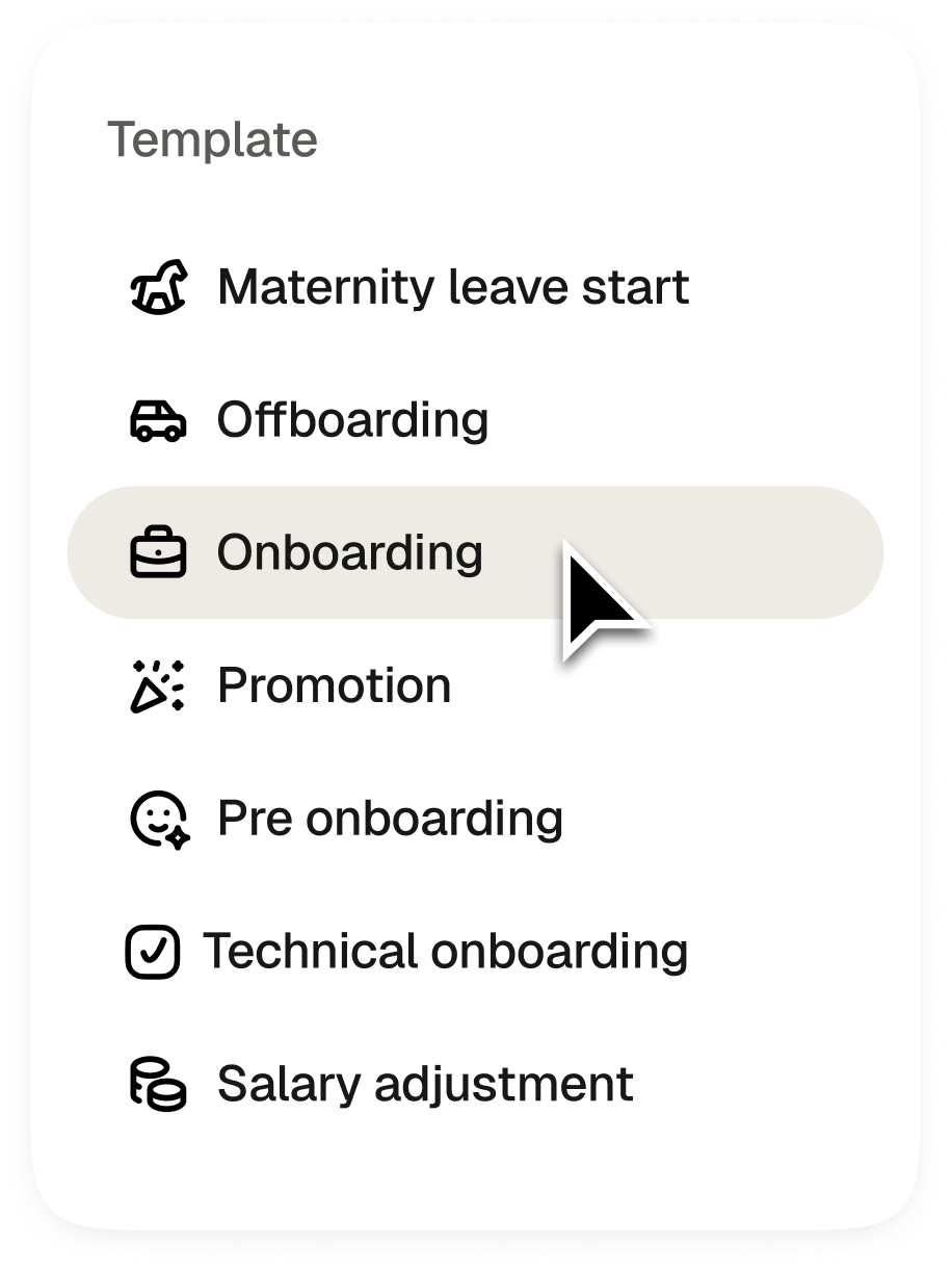 Build and run onboarding, offboarding and parental leave — fast. Set the rules once, and AI handles the rest: triggering tasks, sending comms, flagging anything that needs a human. The process runs itself.
