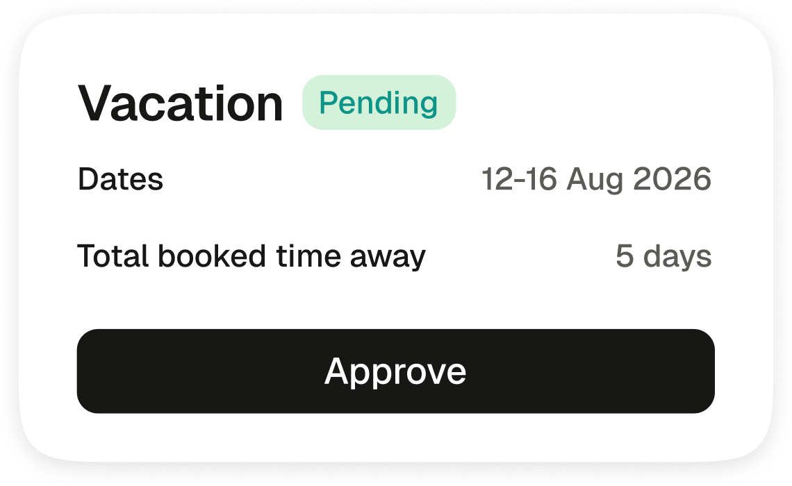 Employees request, managers approve instantly. AI builds policies, syncs payroll and surfaces insights.