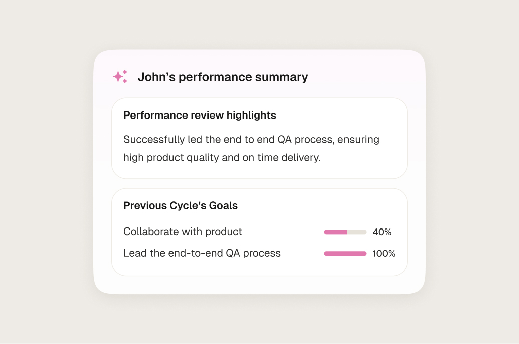 Build review cycles and track goals with AI. Surface insights, spot patterns and give meaningful feedback — without the admin that usually comes with it.