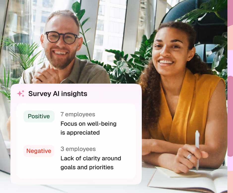 Run any survey — engagement, compensation, exits. AI surfaces patterns across responses and tells you what needs attention, so insights don't sit in a spreadsheet no one reads