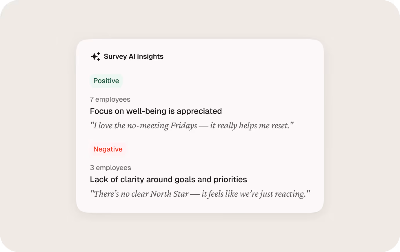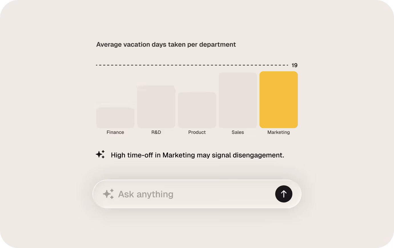 Turn any employee data into insights. Retention, salary, engagement, performance, DEI - are just the tip of the iceberg. All in stunning, AI-powered dashboards.