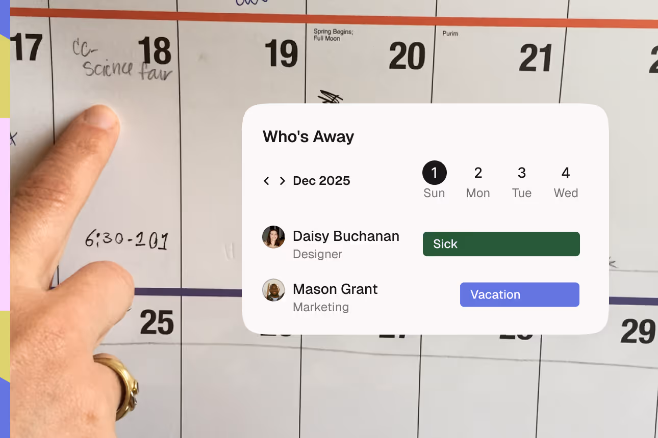 People's time-off syncs automatically so you can see who's in and who's out across all calendars.