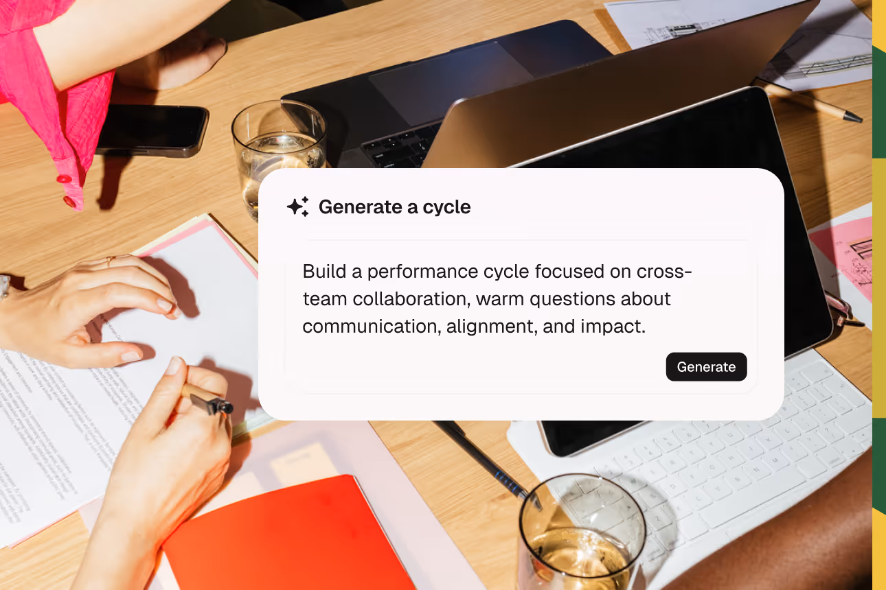 Let AI create your entire cycle from a simple prompt. Focus on specific goals, embed company values, or compare periods. Prefer more control? Choose from ready templates or build it completely on your own.