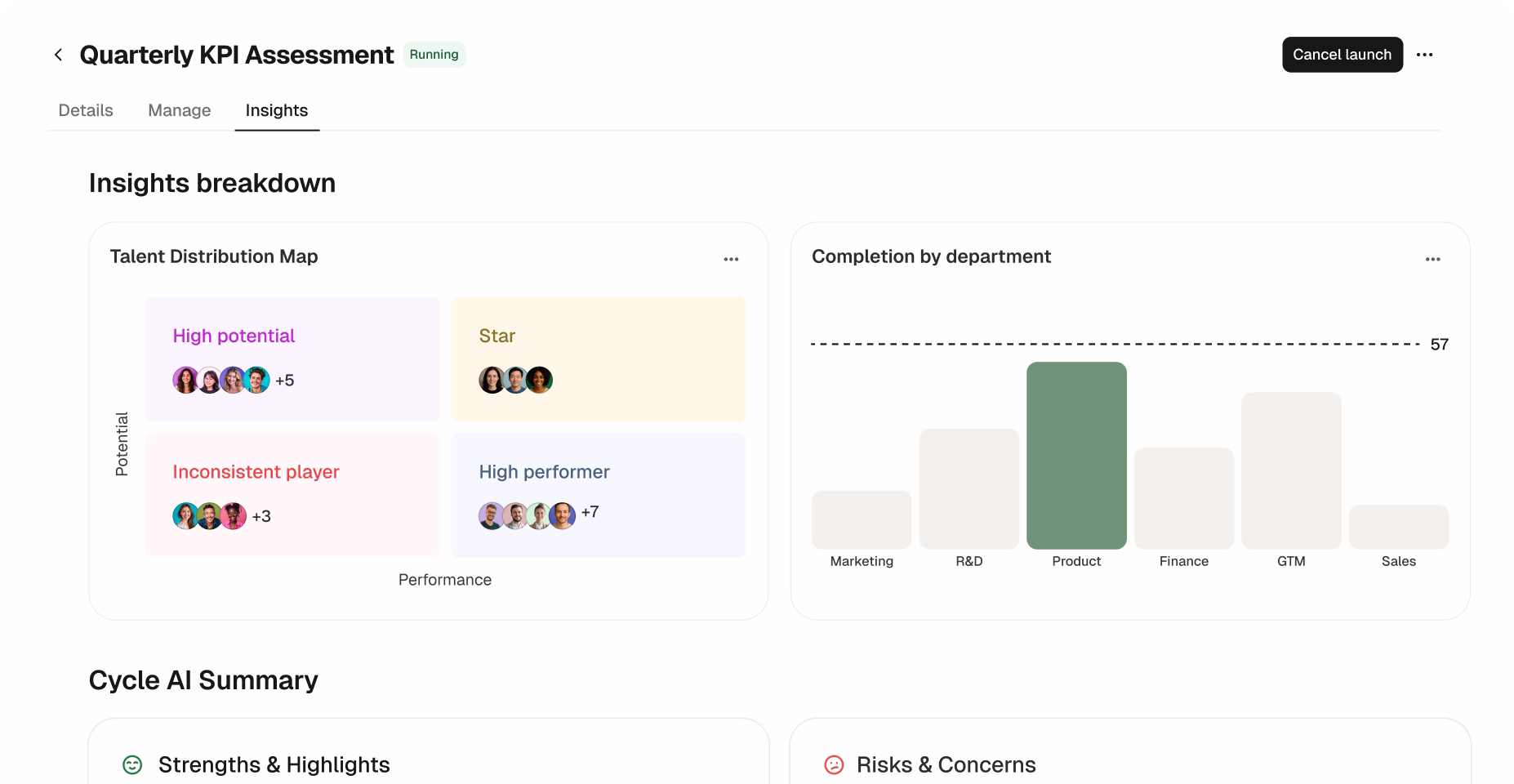 Make feedback and growth effortless with AI. From building cycles to surfacing insights and tracking goals – it's a new era for how you evaluate and develop your people.
