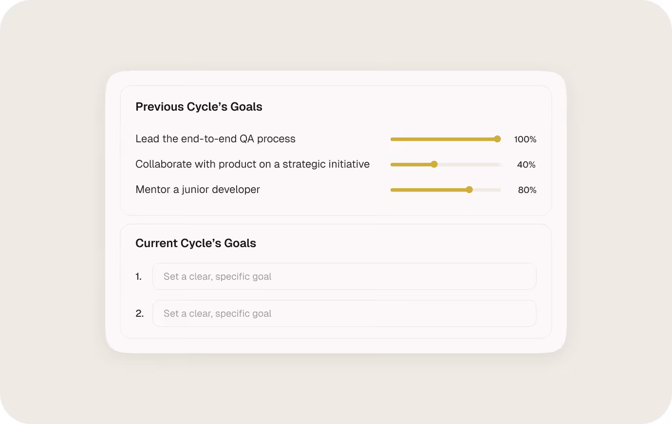 Turn feedback into real progress. Set personal goals, assign weights to each, and track how things improve from cycle to cycle.