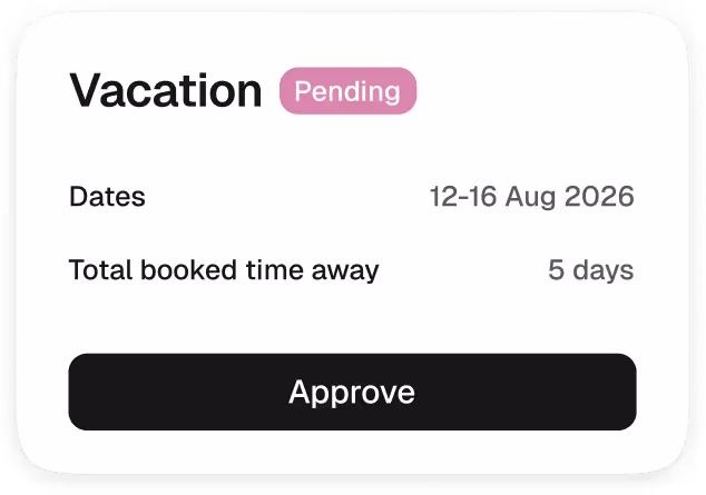 Create time-off policies with AI, let employees request vacation from anywhere, and see who's out at a glance.